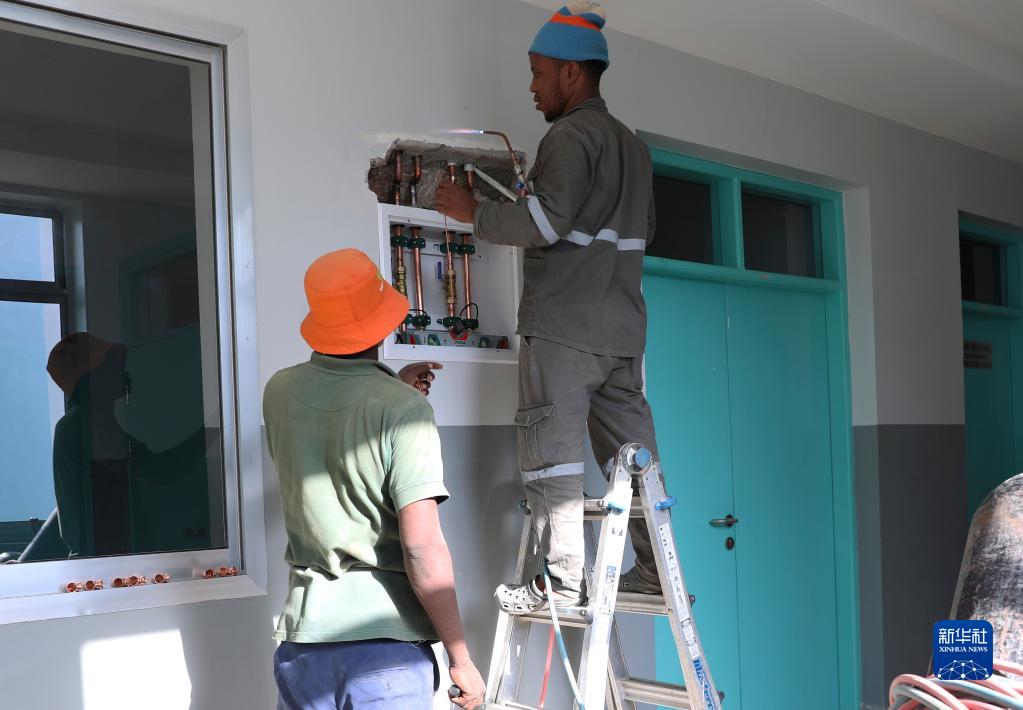 2月21日,工人在坦桑尼亞桑給巴爾島姆布茲尼地區醫院安裝醫用氧氣相關設施。