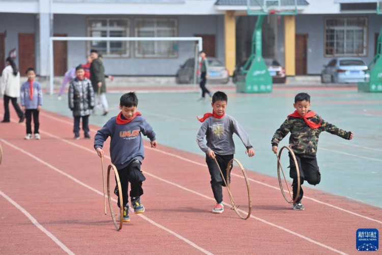2月22日,廣西蒙山縣夏宜民族學校學生在體育課上滾竹環。