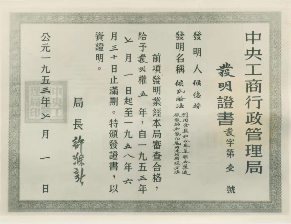 在天津渤化永利化工股份有限公司檔案室,保存著一張發黃的證書,上面寫著“發字第一號”“發明人:侯德榜”“發明名稱:侯氏堿法”……這是1953年頒發的“新中國第一號發明證書”。