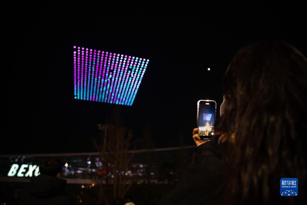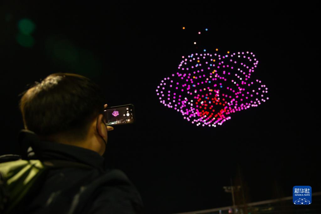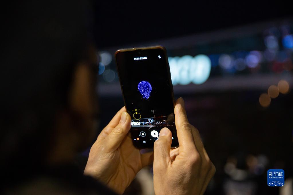 2月23日,參觀者在韓國釜山用手機拍攝2023韓國無人機展上的無人機燈光表演。 當日,韓國最大規模的無人機展覽會——2023韓國無人機展在釜山國際會展中心拉開帷幕,活動將持續至本月25日。本次展覽會共有172家公司參展,中國無人機品牌大疆也參加了此次展覽會,并吸引了眾多參觀者。 新華社記者 王益亮 攝