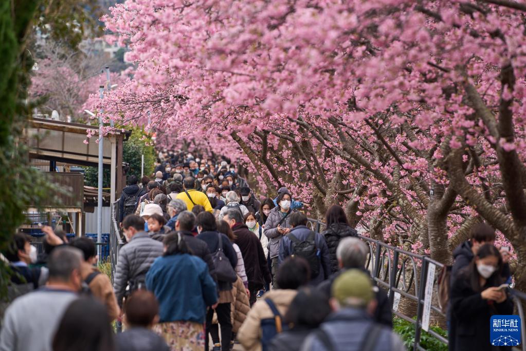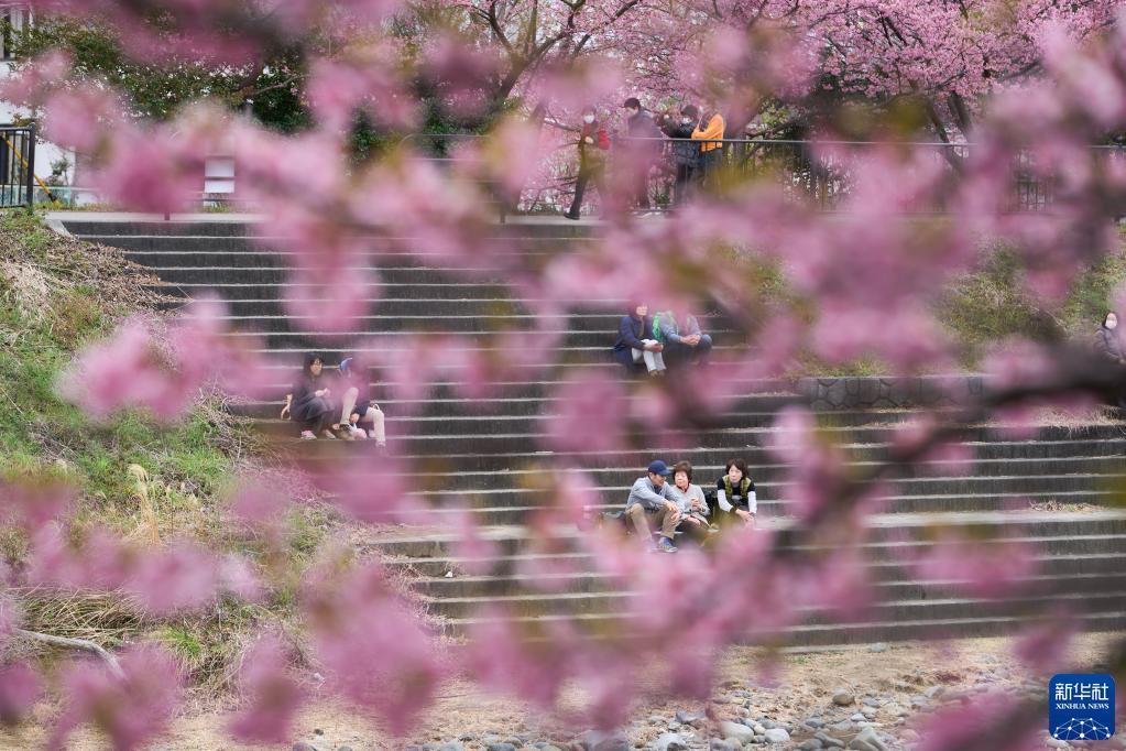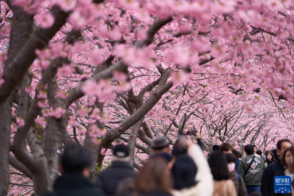 2月24日,游客們在日本靜岡縣河津町欣賞河津櫻。 近日,日本靜岡縣河津町的河津櫻滿開,吸引眾多游客前來觀賞。河津櫻于1955年在河津町被發現,以開花早、花期長而聞名。 新華社記者 張笑宇 攝
