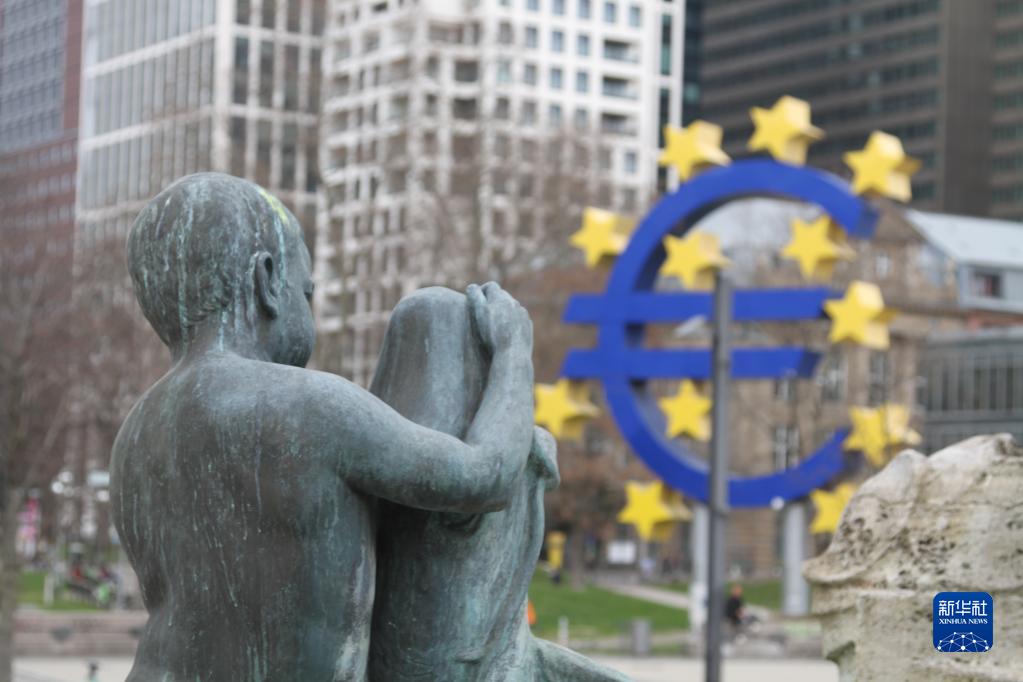 這是2月24日在德國法蘭克福拍攝的歐元雕塑和一座噴泉雕塑。