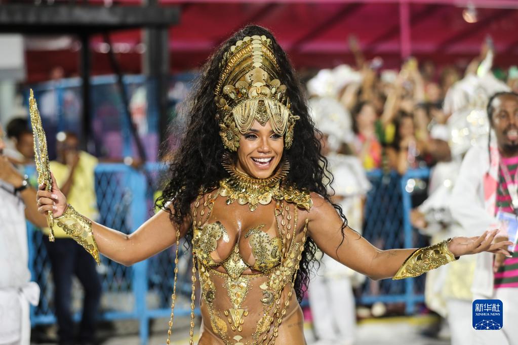 2月25日,在巴西里約熱內盧桑巴大道,一名桑巴舞校的演員參加狂歡節游行。