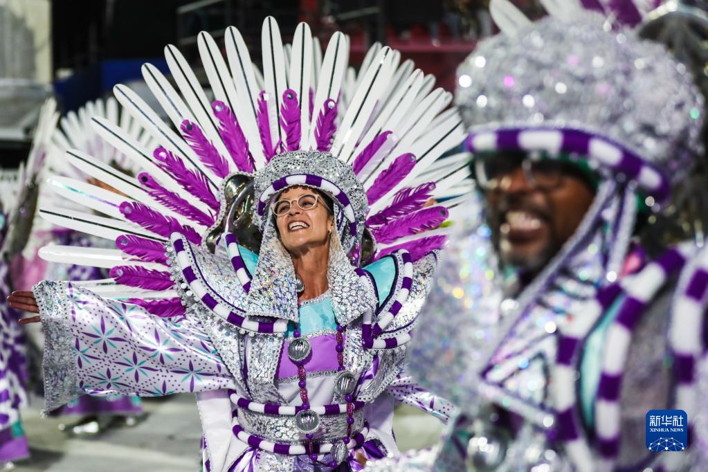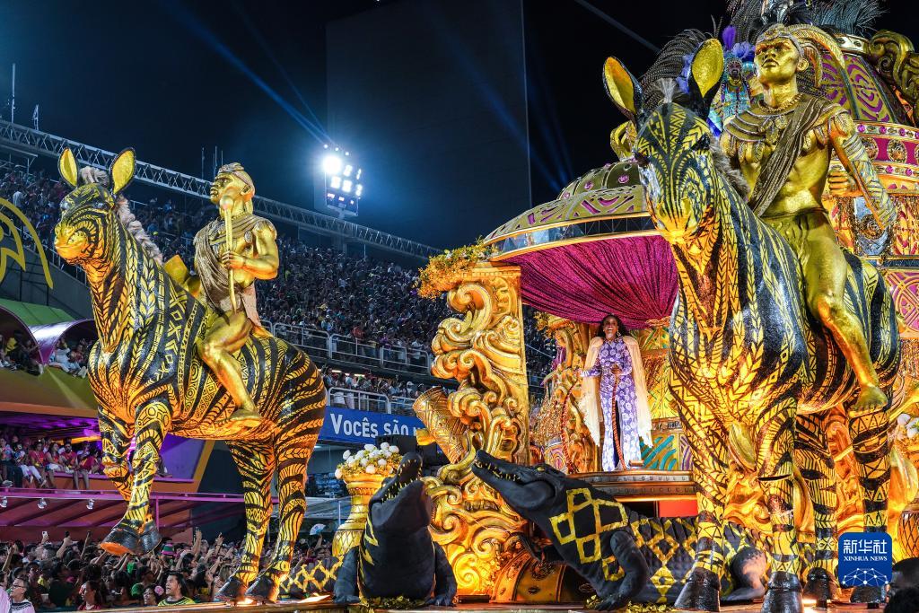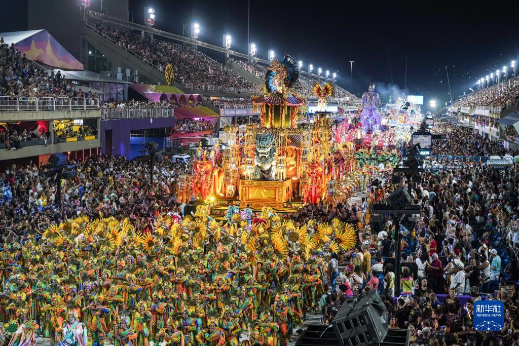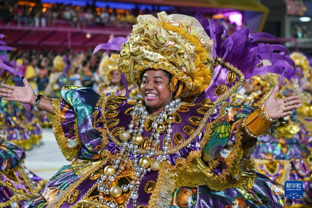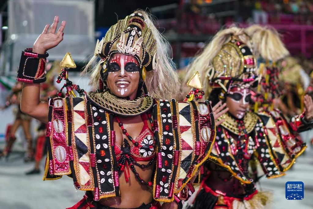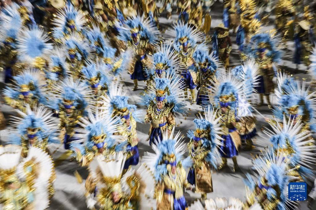2月25日,在巴西里約熱內盧桑巴大道,桑巴舞校的演員參加狂歡節游行。 里約狂歡節是巴西全國規模最大、國際知名度最高的狂歡節,被稱為“地球上最盛大的表演”。25日晚,獲得前六名的特級組桑巴舞校返場進行一場冠軍巡游表演,宣告本年度狂歡節落幕。新華社記者 王天聰 攝