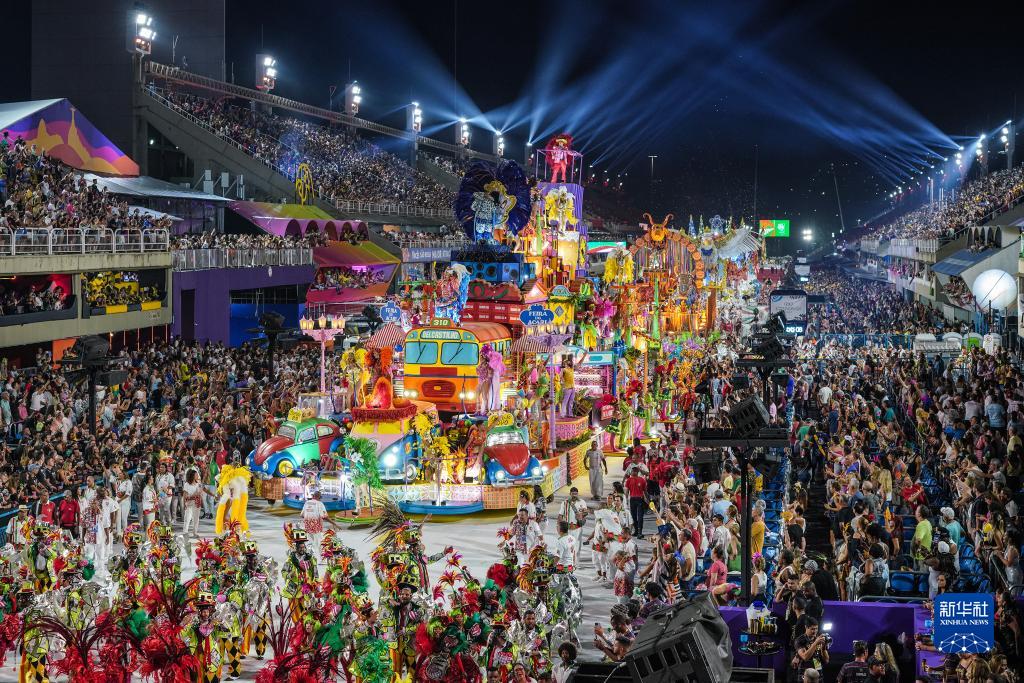 2月26日凌晨,在巴西里約熱內盧桑巴大道,桑巴舞校的演員參加狂歡節游行。 里約狂歡節是巴西全國規模最大、國際知名度最高的狂歡節,被稱為“地球上最盛大的表演”。25日晚,獲得前六名的特級組桑巴舞校返場進行一場冠軍巡游表演,宣告本年度狂歡節落幕。新華社記者 王天聰 攝