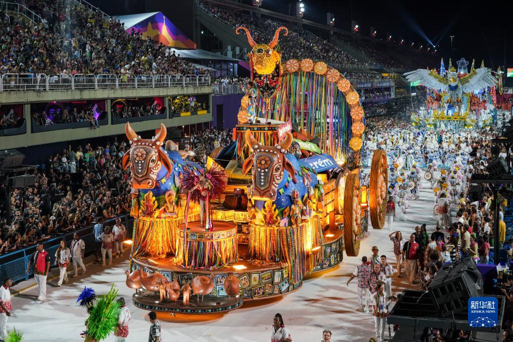 2月25日,在巴西里約熱內盧桑巴大道,花車參加狂歡節游行。 里約狂歡節是巴西全國規模最大、國際知名度最高的狂歡節,被稱為“地球上最盛大的表演”。25日晚,獲得前六名的特級組桑巴舞校返場進行一場冠軍巡游表演,宣告本年度狂歡節落幕。 新華社記者 王天聰 攝