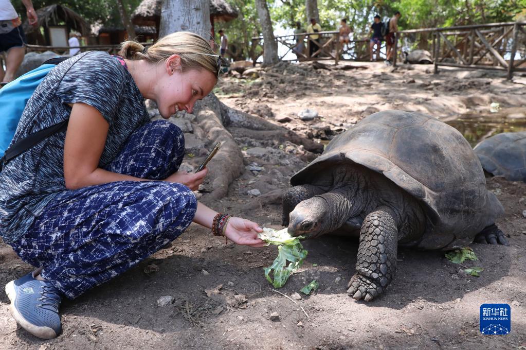 2月23日,游客在坦桑尼亞桑給巴爾島給陸龜喂食。