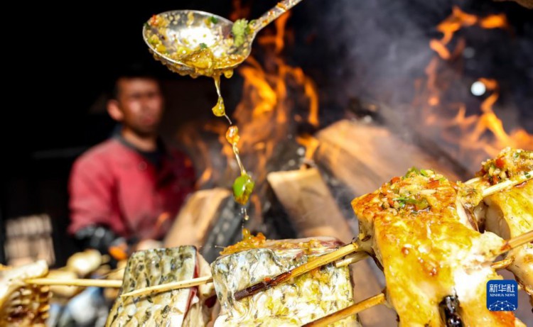 2月26日,在托克扎克鎮農貿市場的一處攤位前,攤主給炙烤的魚塊淋上料汁。