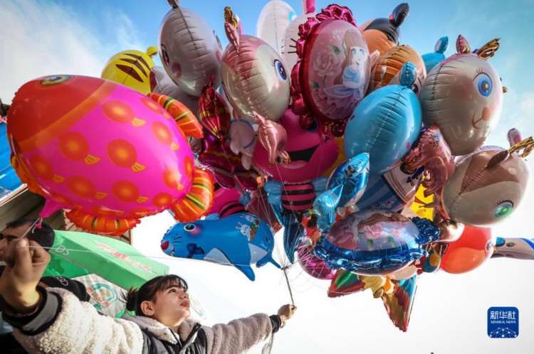 2月26日,在托克扎克鎮農貿市場,商販在給顧客挑選氣球。