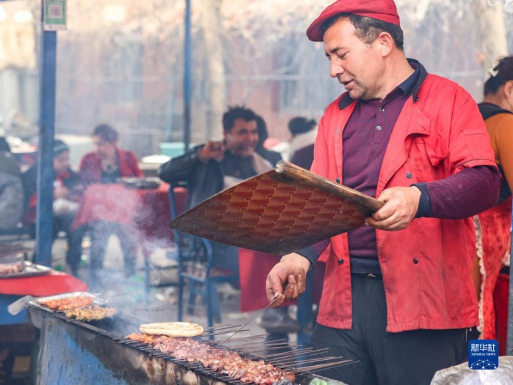 2月26日,在托克扎克鎮農貿市場的一處燒烤攤,攤主在烤制肉串。