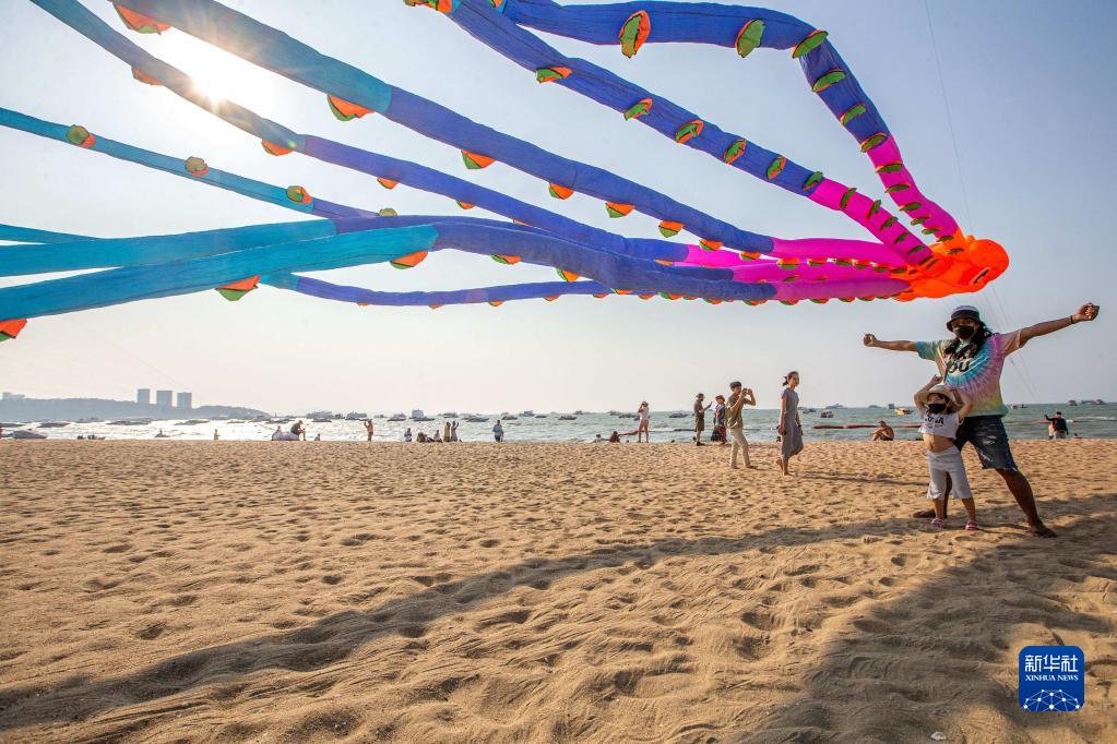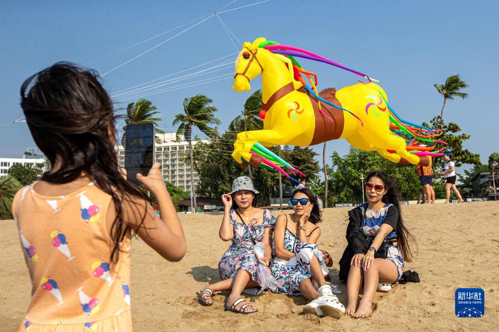 2月27日,游客在泰國芭提雅海灘與風箏合影。泰國芭提雅近日舉辦海灘風箏節。 新華社記者 王騰 攝