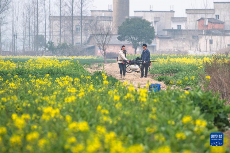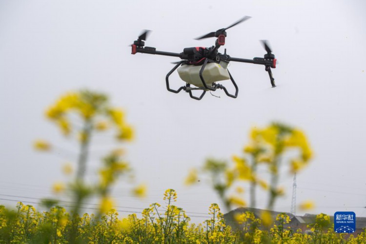 3月1日,在湖北省天門市黃潭鎮一處油菜田,植保無人機正在進行噴藥作業。 正值春耕時節,湖北省天門市農戶利用植保無人機進行播種、噴藥等作業,有效提高了勞動效率,助力春耕生產。 新華社記者肖藝九攝