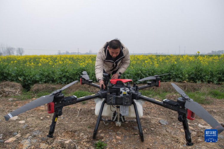 3月1日,在湖北省天門市黃潭鎮一處油菜田,村民準備利用植保無人機進行噴藥作業。 正值春耕時節,湖北省天門市農戶利用植保無人機進行播種、噴藥等作業,有效提高了勞動效率,助力春耕生產。 新華社記者肖藝九攝
