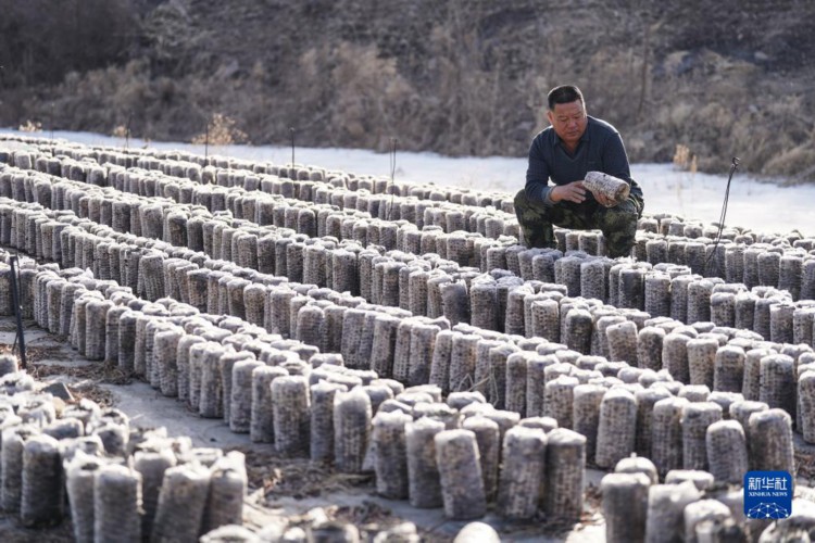 3月4日,“百姓雷鋒”侯清林在查看菌棒的情況。