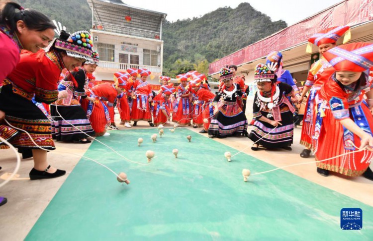當(dāng)日,廣西大化瑤族自治縣大化鎮(zhèn)仁良村舉辦“三八”國(guó)際婦女節(jié)陀螺比賽,壯、瑤、漢等各族婦女歡聚一堂,通過(guò)打陀螺、跳竹竿舞、品長(zhǎng)桌宴等豐富多彩的民俗體育和文化活動(dòng),迎接節(jié)日。