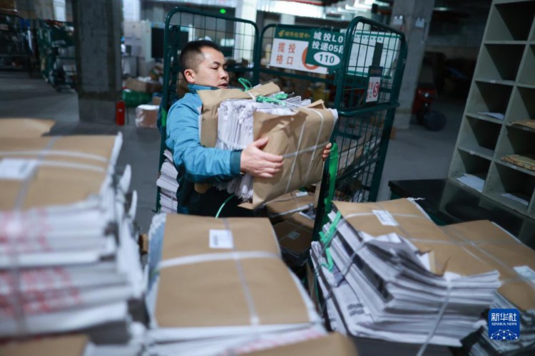 莫富元在貴州省龍里縣草原路郵政郵件處理中心手持當(dāng)天需要分發(fā)的報紙(2月14日攝)。