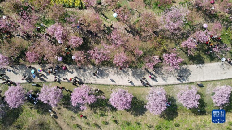 這是3月8日拍攝的都江堰市青城山鎮(zhèn)“問(wèn)花村”櫻花大道一角(無(wú)人機(jī)照片)。