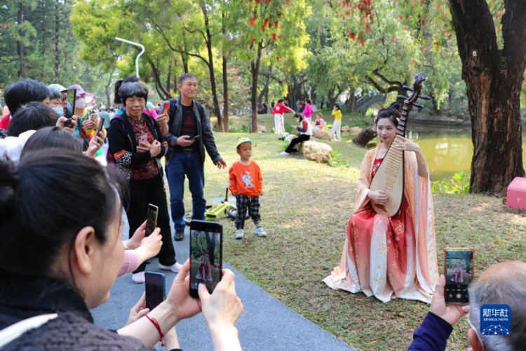 3月8日,游客在深圳人民公園花展現場欣賞樂器演奏表演。 當日,以“春生草木,花開萬象”為主題的2023深圳月季花展開幕。本屆花展由人民公園、福田區香蜜公園、寶安區松崗月季園三園聯動展出,其中主會場人民公園展覽規模達17500平方米,展出約300個月季品種。花展期間,還將舉行音樂表演、花藝沙龍等一系列文化活動。展覽將持續至3月27日。 新華社發(劉慧 攝) |