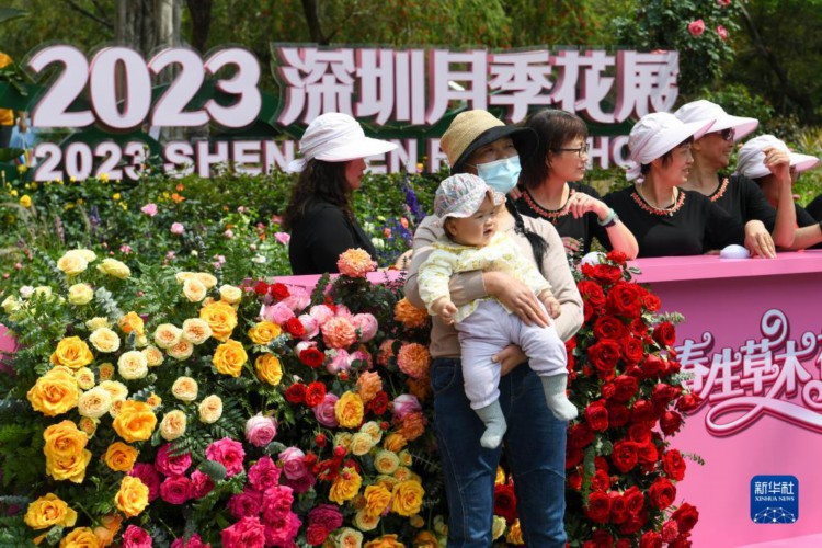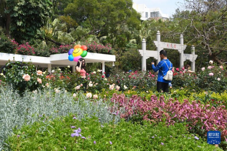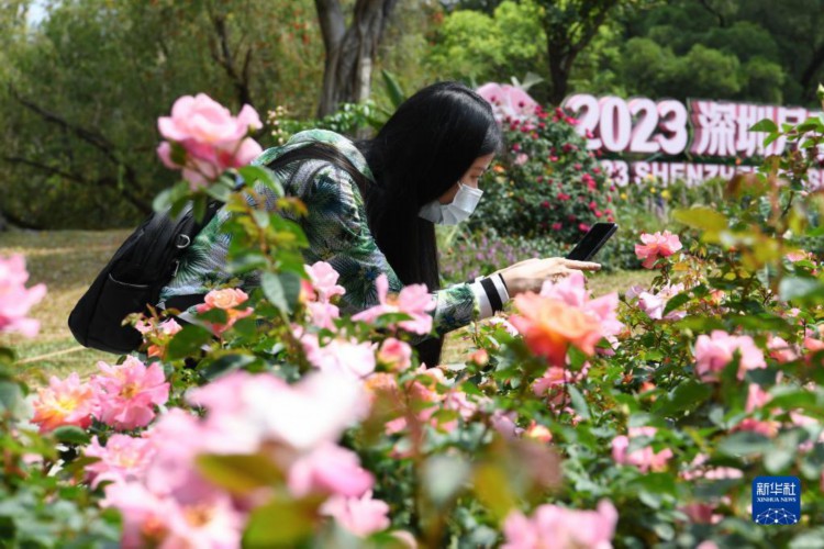 3月8日,游客在深圳人民公園花展現場拍照留念。 當日,以“春生草木,花開萬象”為主題的2023深圳月季花展開幕。本屆花展由人民公園、福田區香蜜公園、寶安區松崗月季園三園聯動展出,其中主會場人民公園展覽規模達17500平方米,展出約300個月季品種。花展期間,還將舉行音樂表演、花藝沙龍等一系列文化活動。展覽將持續至3月27日。 新華社記者 梁旭 攝