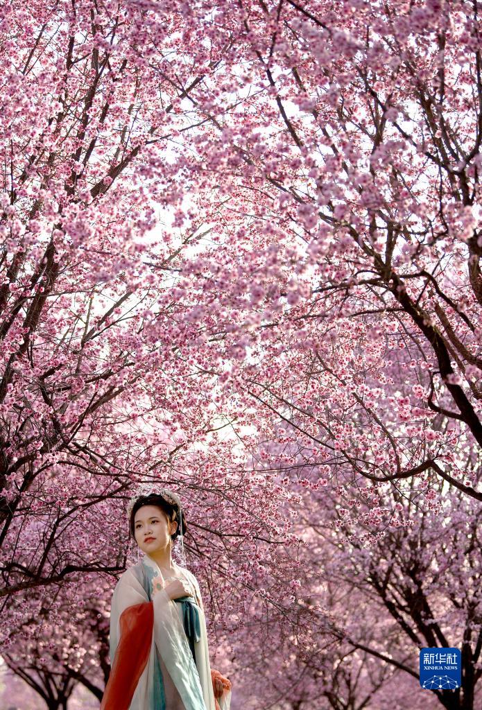 3月14日,古風愛好者在西安大明宮國家遺址公園內賞花留影。