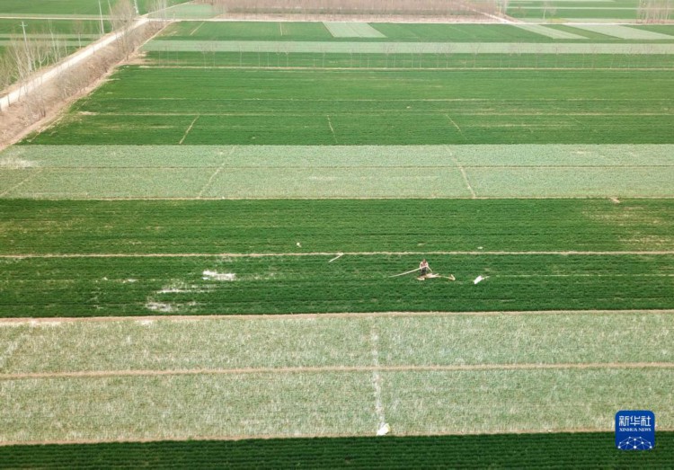 3月15日,在山東省菏澤市牡丹區,村民為小麥澆“返青水”(無人機照片)。 近日,隨著山東多地天氣逐漸轉暖,小麥陸續進入返青期,種植戶緊抓農時給小麥澆水、施肥,為夏糧豐收打好基礎。 新華社記者 徐速繪 攝