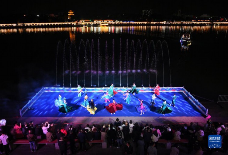 3月21日,在四川省閬中嘉陵江城區段的江面上,演員們在表演實景演出《客來閬中》。 每當夜幕降臨,四川省閬中市嘉陵江城區段燈光璀璨,大型民俗文化移動實景演出在此上演,這種“移步換景”的演出方式吸引眾多游客。近年來,閬中古城為推動夜間經濟發展,充分結合當地文化資源,推出《蜀道盛世》《客來閬中》等實景演出,增加游客夜游體驗,帶動當地文旅消費。 新華社記者 劉潺 攝