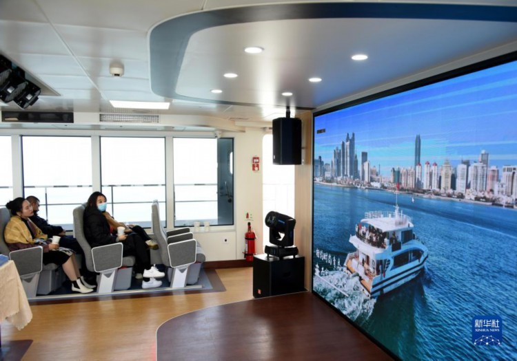 3月27日,游客在游船上觀看青島文旅推介宣傳片。