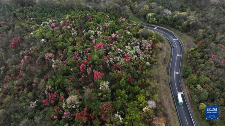 3月28日,百里杜鵑景區(qū)醉九牛景點附近杜鵑花盛開(無人機照片)。 近日,隨著氣溫逐漸升高,位于貴州省畢節(jié)市百里杜鵑管理區(qū)的天然野生杜鵑花次第盛開,逐漸進入盛花期。據(jù)了解,百里杜鵑林帶綿延百里,故稱“百里杜鵑”。 新華社記者 劉續(xù) 攝
