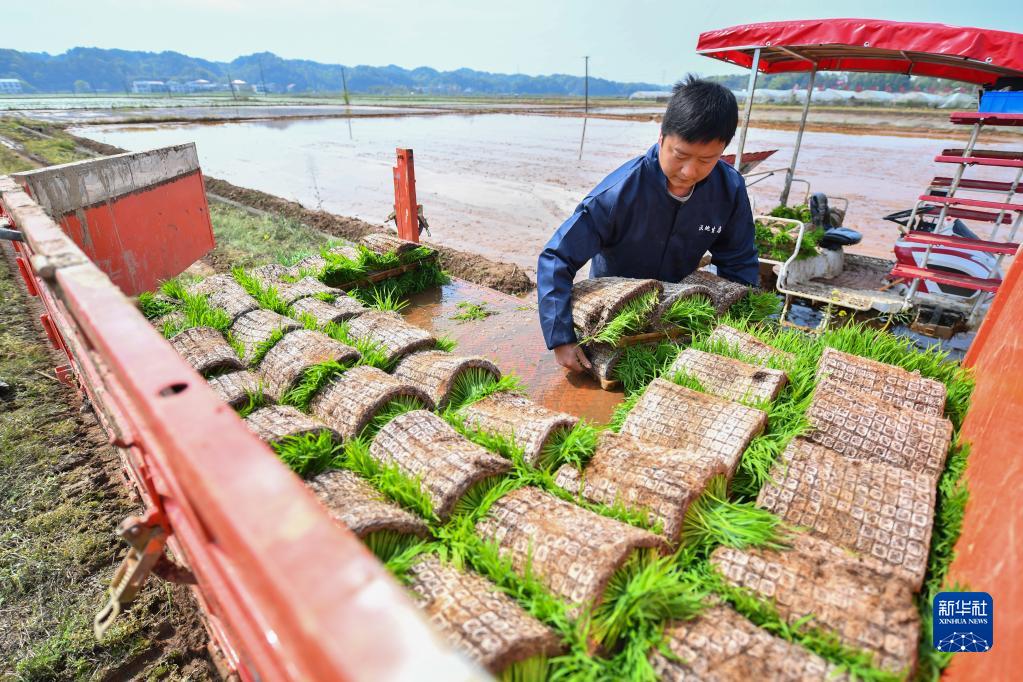 3月31日,在湖南省瀏陽市龍伏鎮(zhèn)的雙季稻種植示范基地,農(nóng)民在搬運秧苗。