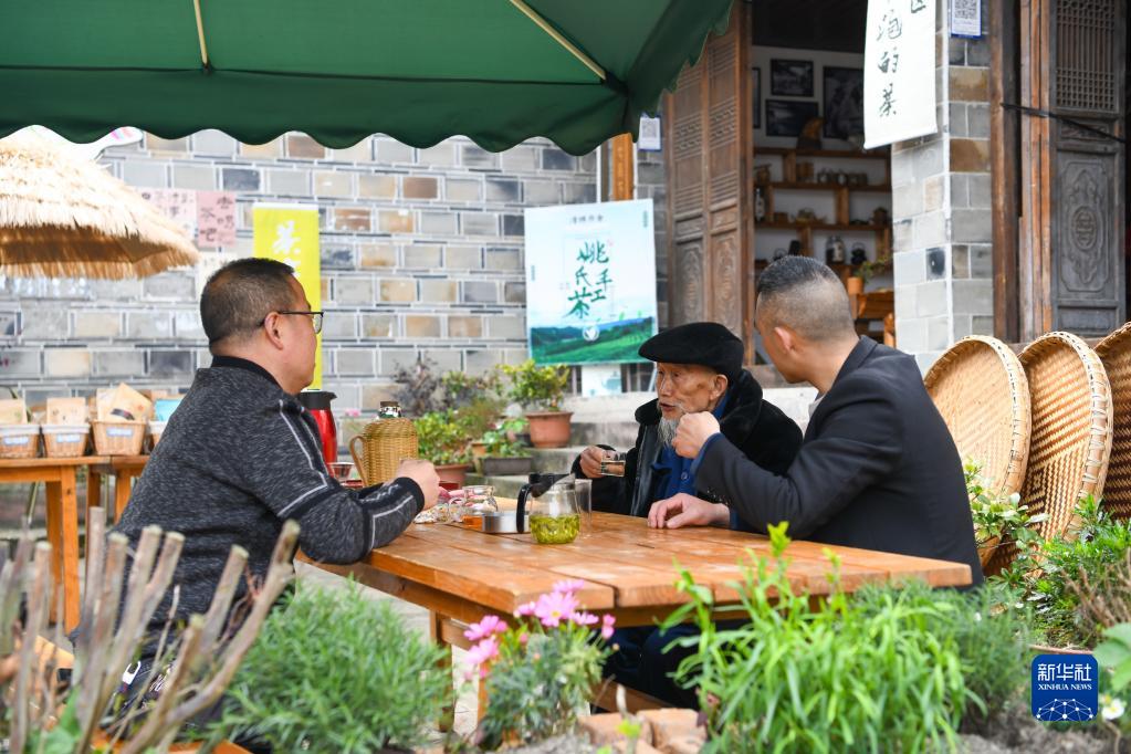 4月4日,在四川省汶川縣水磨鎮禪壽老街,游客在一家茶鋪前品茶。 新華社記者 王曦 攝