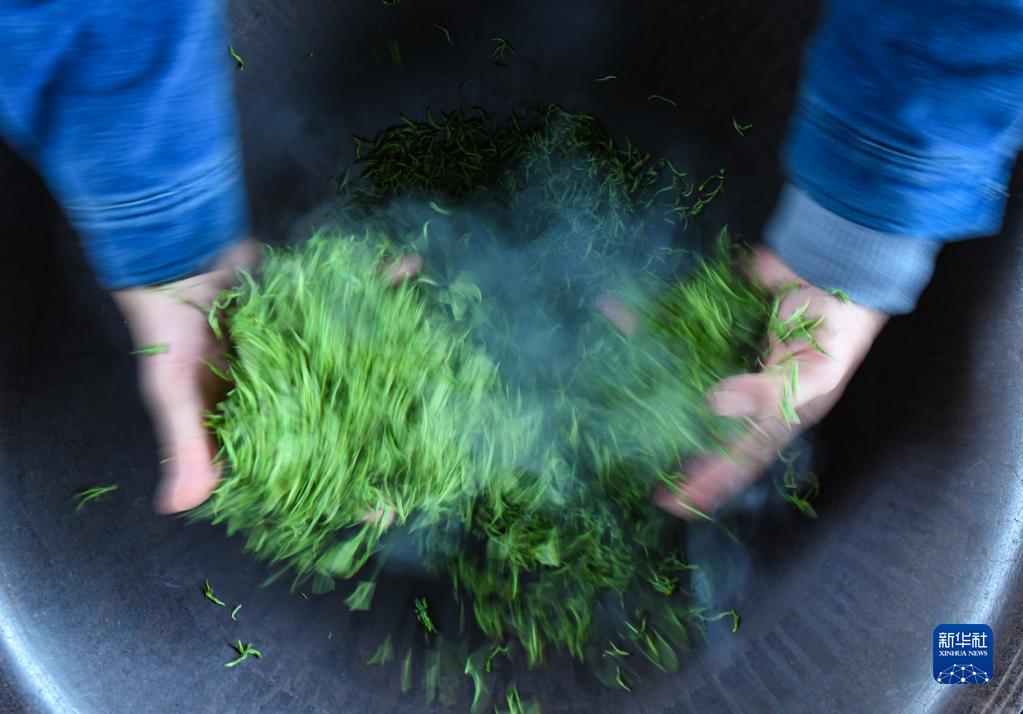 4月4日,在四川省汶川縣水磨鎮牛塘溝村,當地茶農在將茶葉炒青。 清明時節,位于四川省汶川縣的上萬畝春茶陸續開采,茶農趁著天氣晴朗忙著采摘今年的第一撥春茶。 汶川縣南部片區自然生態環境適宜茶葉生長,近年來以茶賦能,通過“合作社+茶農”“公司+農戶”等模式,大力推動汶川茶業振興,持續促進區域內群眾鞏固脫貧成果。 新華社記者 王曦 攝