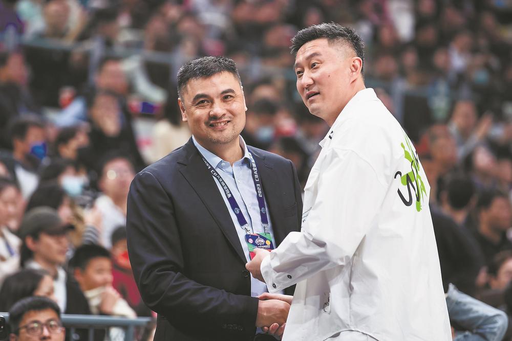 3月26日,劉玉棟(左)在廈門舉行的CBA全明星周末上與廣東隊主教練杜峰交談。