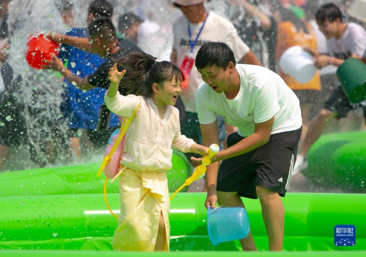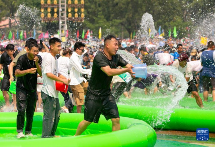 4月12日,人們在芒市廣場慶祝潑水節。 當日,云南省德宏傣族景頗族自治州芒市2023年潑水狂歡節開幕,人們相互潑灑代表幸福、吉祥的清水,表達著相互間的無限祝福。 新華社記者 陳欣波 攝