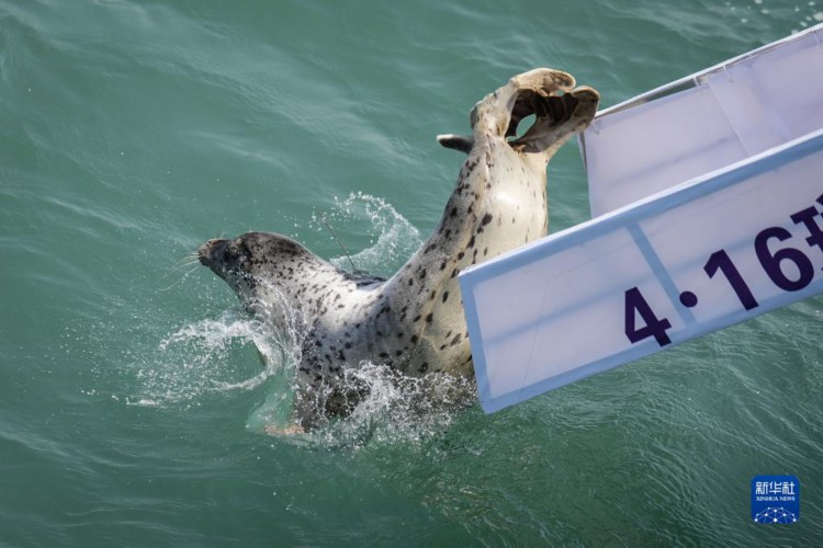 4月16日,一頭西太平洋斑海豹躍入海中。 當日,由農(nóng)業(yè)農(nóng)村部漁業(yè)漁政管理局、中國野生動物保護協(xié)會、中國野生動物保護協(xié)會水生野生動物保護分會等單位主辦的“第二屆斑海豹保護宣傳日”活動啟動。今年的斑海豹保護宣傳日以“保護斑海豹 你我同行動”為主題。在活動主會場大連,7頭西太平洋斑海豹被放歸大海。 新華社記者 潘昱龍 攝