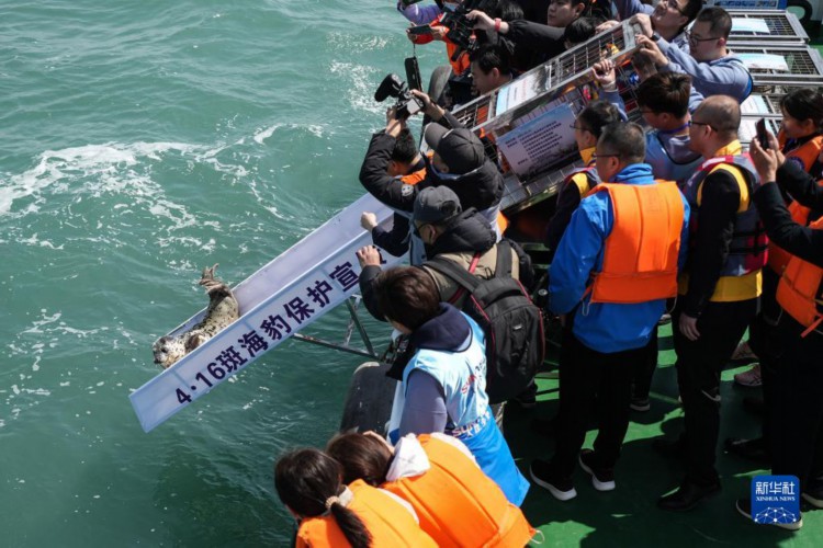 4月16日,工作人員將西太平洋斑海豹放入大海。 當日,由農(nóng)業(yè)農(nóng)村部漁業(yè)漁政管理局、中國野生動物保護協(xié)會、中國野生動物保護協(xié)會水生野生動物保護分會等單位主辦的“第二屆斑海豹保護宣傳日”活動啟動。今年的斑海豹保護宣傳日以“保護斑海豹 你我同行動”為主題。在活動主會場大連,7頭西太平洋斑海豹被放歸大海。 新華社記者 潘昱龍 攝