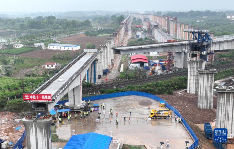 滬渝蓉高速鐵路荊門特大橋跨焦柳鐵路連續梁轉體前(4月18日攝,無人機照片)。 當日,中鐵十一局承建的滬渝蓉高速鐵路荊門特大橋跨焦柳鐵路連續梁順利轉體,這是滬渝蓉高鐵完成轉體施工的首座轉體橋。 滬渝蓉高鐵途經上海、江蘇、安徽、湖北、重慶、四川等六省市,線路總長約2100公里,全線設計時速350公里,是國家“八縱八橫”高鐵骨干通道之一。 新華社記者 程敏 攝 |