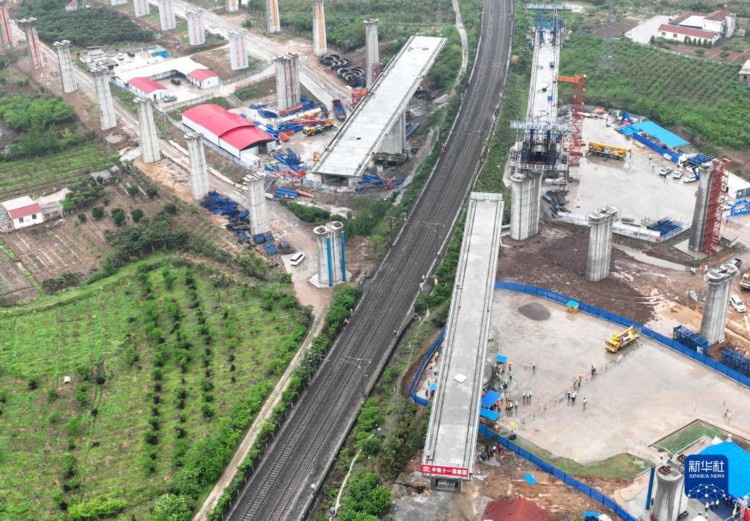 滬渝蓉高速鐵路荊門特大橋跨焦柳鐵路連續梁轉體前(4月18日攝,無人機照片)。 當日,中鐵十一局承建的滬渝蓉高速鐵路荊門特大橋跨焦柳鐵路連續梁順利轉體,這是滬渝蓉高鐵完成轉體施工的首座轉體橋。 滬渝蓉高鐵途經上海、江蘇、安徽、湖北、重慶、四川等六省市,線路總長約2100公里,全線設計時速350公里,是國家“八縱八橫”高鐵骨干通道之一。 新華社記者 程敏 攝