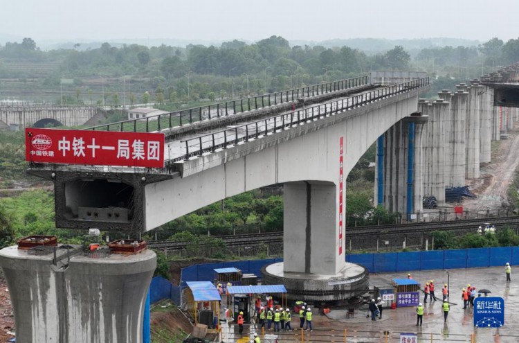 當日,中鐵十一局承建的滬渝蓉高速鐵路荊門特大橋跨焦柳鐵路連續梁順利轉體,這是滬渝蓉高鐵完成轉體施工的首座轉體橋。