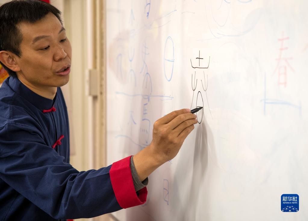 4月19日,南非約翰內斯堡大學孔子學院教師李寶生講解漢字“春”的演變。 當日,約翰內斯堡大學孔子學院舉行聯合國中文日主題活動,吸引眾多學生到場參與。 新華社記者 張譽東 攝