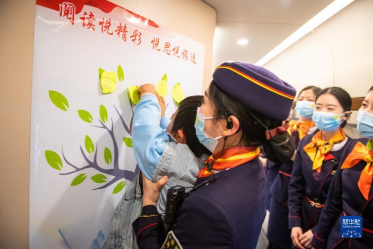 4月23日,在由株洲西發往上海虹橋的G1348次列車上,廣鐵集團長沙客運段動二車隊舉辦好書閱讀分享會活動,小乘客在列車上分享閱讀繪本后的感受。