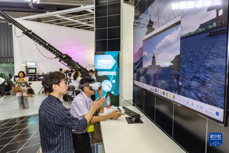 5月5日,在中國影視科技創新成果展上,嘉賓利用VR設備體驗元宇宙場景。