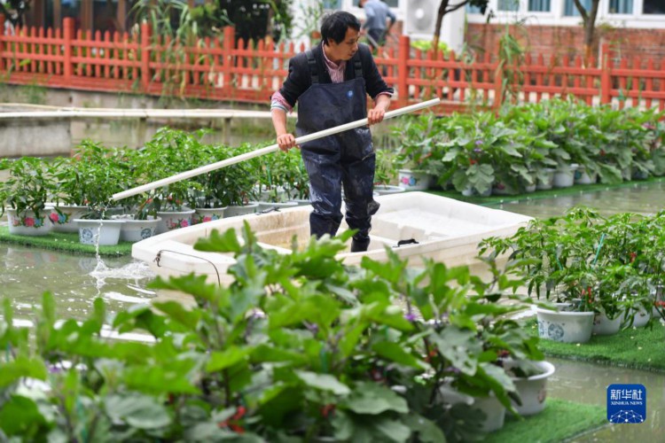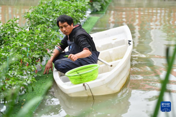 5月11日,在長沙市望城區高塘嶺街道湘江村,農民采摘水上種植的辣椒。 近年來,在湖南省長沙市望城區高塘嶺街道湘江村,當地農民利用“水上種植”技術,在池塘的水面上進行水稻、蔬菜、花卉種植,使魚蝦與水稻、蔬菜、花卉共生互補,通過“一水兩用、一水兩收”,實現資源和空間的充分利用,助力農民增產增收。 新華社記者 陳澤國 攝