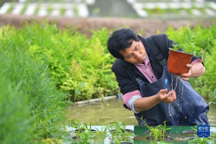 5月11日,在長沙市望城區高塘嶺街道湘江村,農民檢查水上種植的空心菜的根部。 近年來,在湖南省長沙市望城區高塘嶺街道湘江村,當地農民利用“水上種植”技術,在池塘的水面上進行水稻、蔬菜、花卉種植,使魚蝦與水稻、蔬菜、花卉共生互補,通過“一水兩用、一水兩收”,實現資源和空間的充分利用,助力農民增產增收。 新華社記者 陳澤國 攝