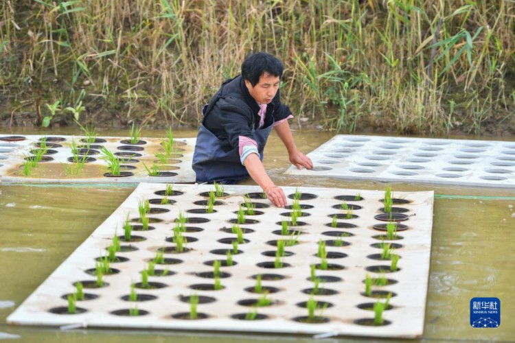 5月11日,在長沙市望城區高塘嶺街道湘江村,農民打理剛移栽的水稻秧苗。 近年來,在湖南省長沙市望城區高塘嶺街道湘江村,當地農民利用“水上種植”技術,在池塘的水面上進行水稻、蔬菜、花卉種植,使魚蝦與水稻、蔬菜、花卉共生互補,通過“一水兩用、一水兩收”,實現資源和空間的充分利用,助力農民增產增收。 新華社記者 陳澤國 攝