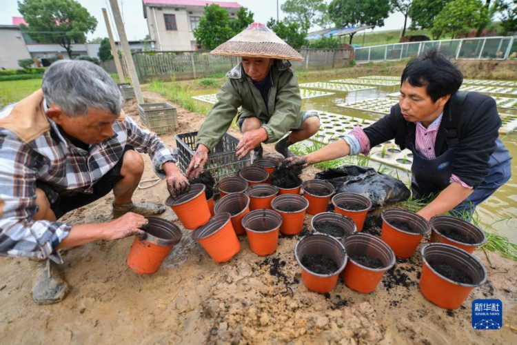 5月11日,在長沙市望城區高塘嶺街道湘江村,農民將水稻秧苗插入盆中。 近年來,在湖南省長沙市望城區高塘嶺街道湘江村,當地農民利用“水上種植”技術,在池塘的水面上進行水稻、蔬菜、花卉種植,使魚蝦與水稻、蔬菜、花卉共生互補,通過“一水兩用、一水兩收”,實現資源和空間的充分利用,助力農民增產增收。 新華社記者 陳澤國 攝