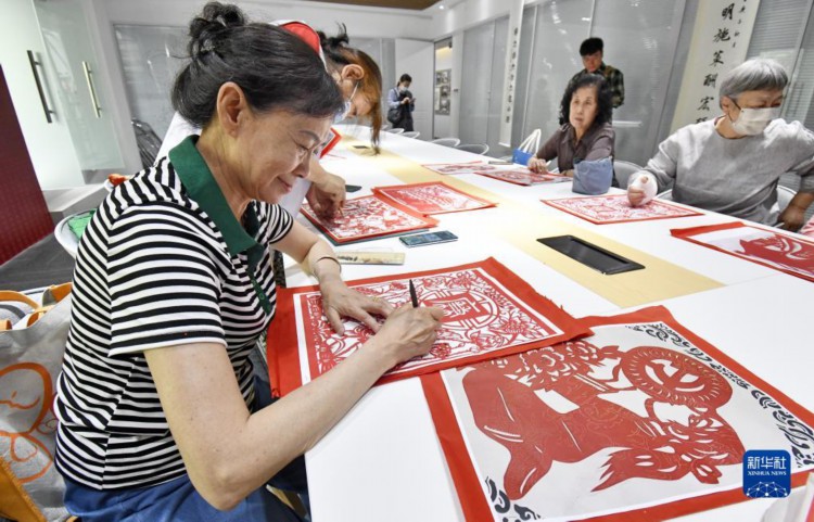 朝陽無限社區的老年人在社區養老驛站參加剪紙活動(5月17日攝)。