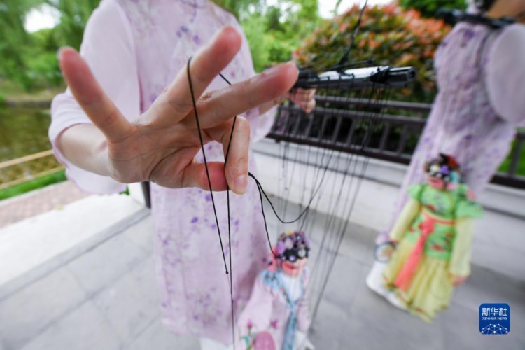 孫菁和施錦芳在蘇州市吳江區七都鎮一處公園內進行排練(4月18日攝)。他們手提十多根線操縱著約六十厘米高、七八斤重的木偶,通過手指、形體動作來操控木偶的動作神態。