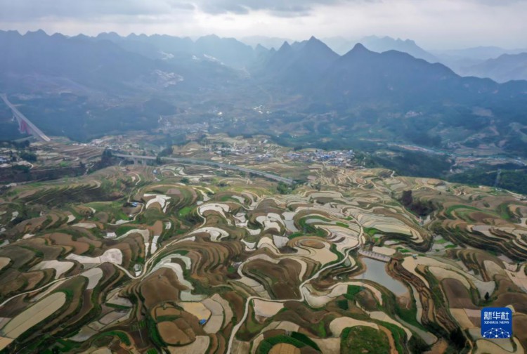 5月28日早晨在貴州省銅仁市江口縣高墻村拍攝的梯田風光(無人機照片)。 初夏時節,山地賞花、古鎮體驗民俗、山水觀光等成為出游貴州的熱門選擇,美景如畫的貴州進入旅游旺季。 新華社發(李鶴 攝)