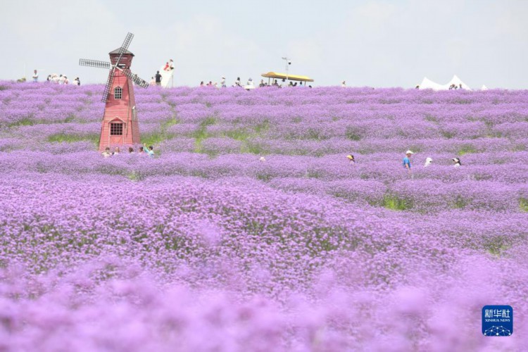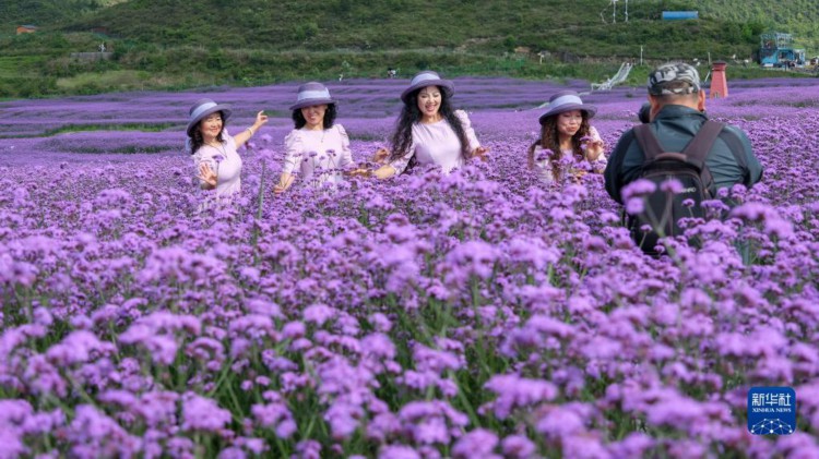 5月27日,游客在貴州省貴陽市花溪區高坡鄉石門村的馬鞭草花海中游玩賞花。 初夏時節,山地賞花、古鎮體驗民俗、山水觀光等成為出游貴州的熱門選擇,美景如畫的貴州進入旅游旺季。 新華社發(王波 攝)