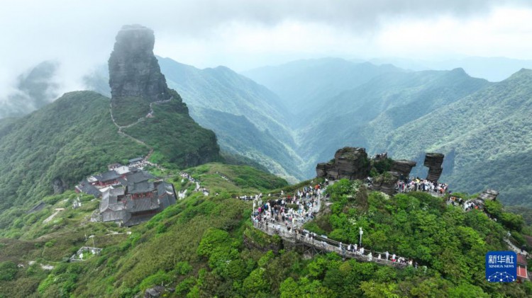 5月27日,游客在位于貴州省銅仁市的梵凈山景區游覽(無人機照片)。 初夏時節,山地賞花、古鎮體驗民俗、山水觀光等成為出游貴州的熱門選擇,美景如畫的貴州進入旅游旺季。 新華社發(胡攀學 攝)